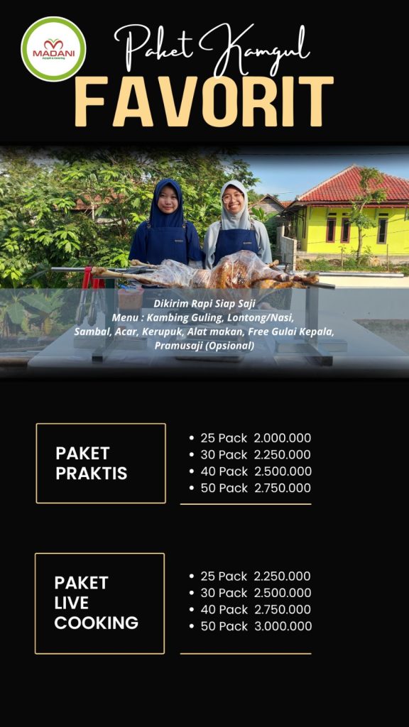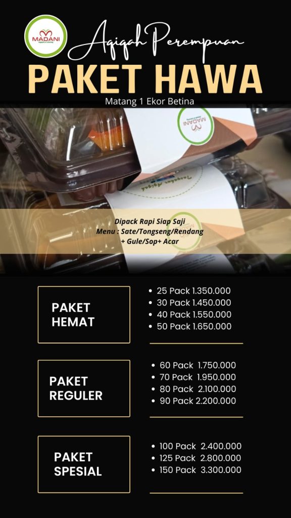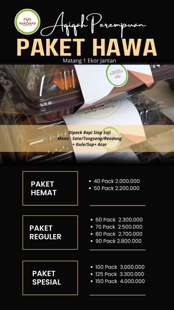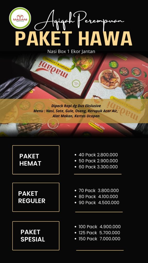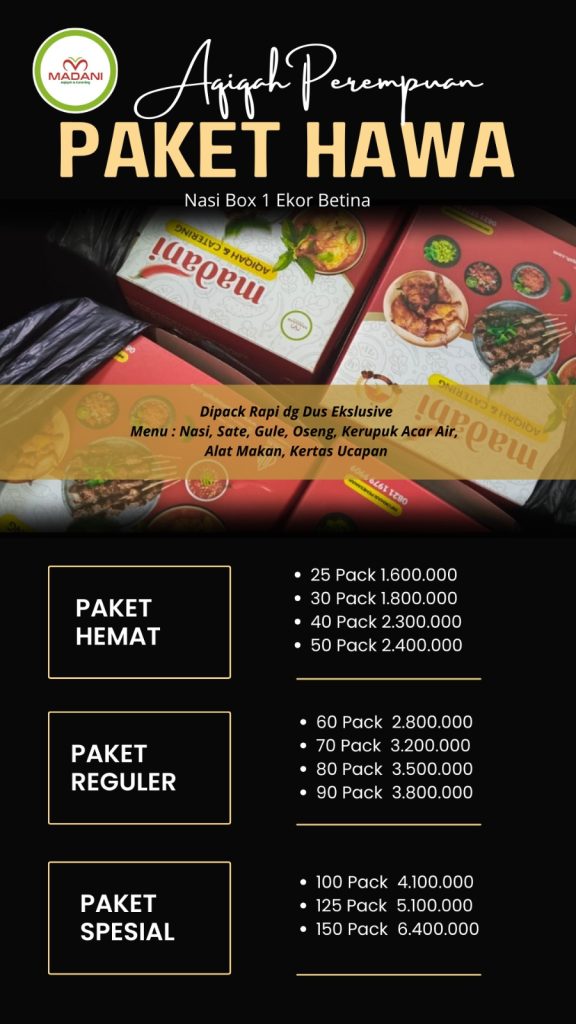 Paket Aqiqah untuk Anak Perempuan, yaitu 1 ekor kambing yang dipotong dan diolah siap saji dalam bentuk matang dan nasi box.